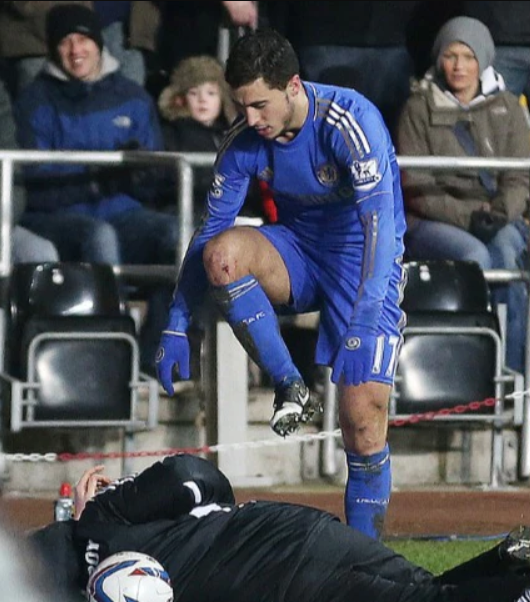 Eden Hazard, Chelsea’s Belgian wizard, was incensed. In a split-second decision born of pure frustration, he tried to dislodge the ball from under the boy with his foot. The connection was made, the boy clutched his ribs, and the referee immediately branded a red card.